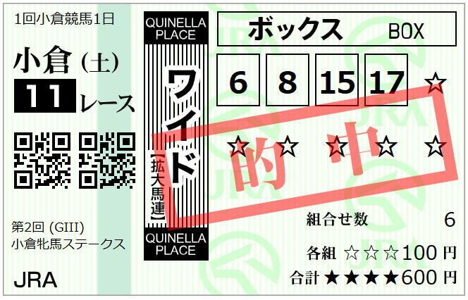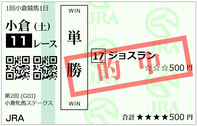 ・小倉牝馬S 【◎-〇】【1-1】着候補 (単勝的中♪)