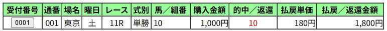 印は 【◎--】で、消去法は【1--】着候補決着。馬券は本命馬の単勝1点買いが的中して回収率180%!安かったけど、久々の1点買い快心的中でした。
