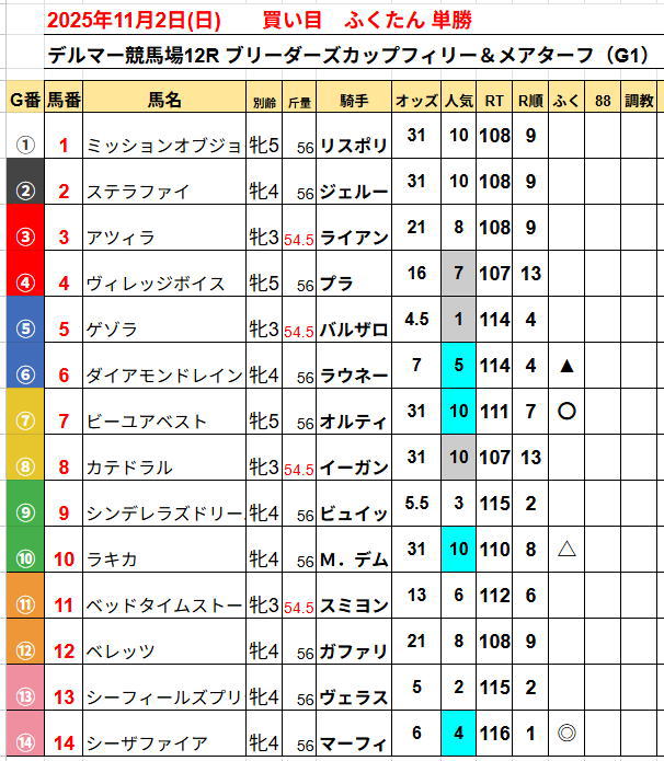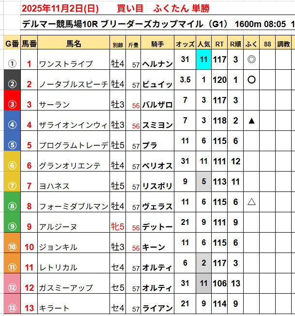 ブリーダーズカップのオリジナル出走表を掲載してます。っと言ってもエクセルでまとめただけですが……。データ的な買いの強調材料が多い馬を黄色、RT順が悪いのにブックメーカーオッズが低い馬や減点材料に該当した馬をグレー色、逆にレーティング順位が良いのにブックメーカーオッズが高い馬の数字を青にしてます。