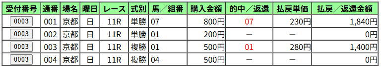 ・投票 4000円⇒回収 3240円