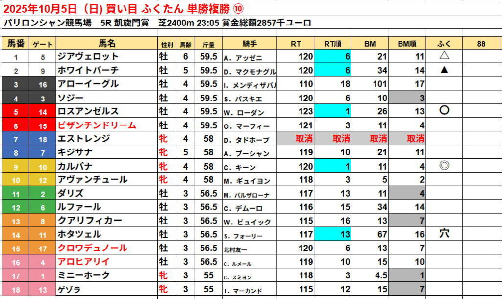 凱旋門賞のオリジナル出走表を掲載してます。っと言ってもエクセルでまとめただけですが……。データ的な買いの強調材料が多い馬を黄色、RT順が悪いのにブックメーカーオッズが低い馬や減点材料に該当した馬をグレー色、逆にレーティング順位が良いのにブックメーカーオッズが高い馬の数字を青にしてます。