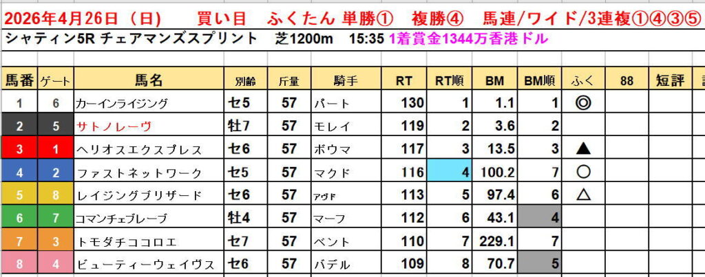 2026年4月26日(日)香港のシャティン競馬場で行われる香港チャンピオンズデー2026、国内発売される海外競馬予想です。発走時間はチェアマンズスプリントプライズが5Rで15:35(日本時間・以下同)、チャンピオンズマイルが7Rで16:45、クイーンエリザベス2世カップが9Rで17:55、となってます。馬券購入の際はお気をつけください。