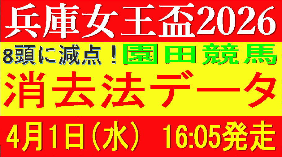 2026年4月1日(水)園田競馬場で行われる、兵庫女王盃2026の競馬予想です。1870m戦で16:05の発走です。南関の交流重賞は牡馬クラシックが全てJpn1になった関係で古馬戦が押し出され気味で、このレースも例に漏れず前身はTCK女王盃です。住み分けができてるのは評価したい1点ですが、何とか共存できないんですかネw。データは旧TCK女王盃含む過去3年で検証してます。