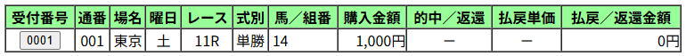 印は 【-◎-】で、消去法は【-1-】着候補決着。馬券は本命馬の単勝1点買いがノーヒットでした。嫌った人気馬に走られ、買った人気馬が凡走しては完敗です。